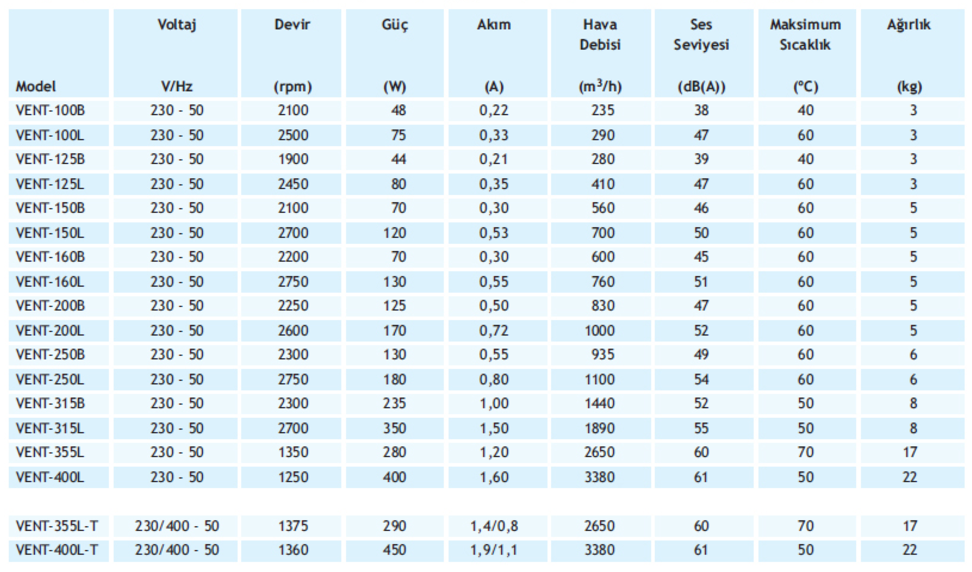 B Versiyonu: Standart performanslı, düşük ses seviyeli modeller.100, 125, 150, 160 modellerde fan pervaneleri plastiktir.